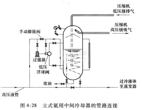 雙級氨制冷壓縮機濕行程的發生與處理過程,往往與中間冷卻器有關。中間冷卻器簡稱中冷器,是維持兩級或多級壓縮制冷循環正常工作的必需設備,位于制冷壓縮機的低、高壓級之間。立式氨用中間冷卻器的管路連接,如圖4-28所示。