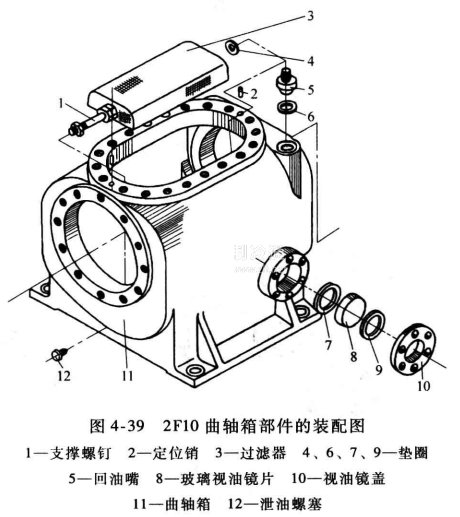2)安裝曲軸箱側面的視油鏡。裝配時要注意墊圈7、 9的厚度不能隨意改變,否則容易漏油或壓碎玻璃視油鏡片8。