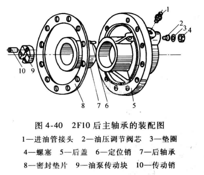 3)裝配2F10后主軸承,如圖4-40所示。將后軸承7裝入后蓋5的軸承座孔內(nèi),輕輕轉動后軸承7,使定位銷6對準定位銷孔,定位銷的作用是防止曲軸轉動時帶動軸承旋轉。在后蓋5端面上貼上密封墊片8,再將其推入曲軸箱的后蓋孔內(nèi),對正位置后均勻擰緊螺栓,使之固定在機體上。之后安裝進油管接頭1(內(nèi)接油泵輸油口,外接油壓表)、油壓調(diào)節(jié)閥芯2及螺塞4。