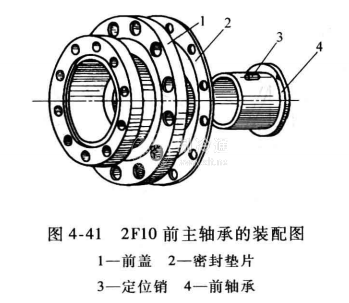 5)裝配2F10前主軸承,如圖4-41所示。把前軸承4裝入前蓋1的軸承座孔內(nèi),輕輕轉動前軸承4,使定位銷3對準定位銷孔,以防后軸承轉動。把密封墊片2貼在前蓋1端面上,托著前蓋,使主軸頸進入前軸承,然后把前蓋、墊片貼在曲軸箱的前蓋孔上,對正位置后均勻擰緊螺栓,使之固定在機體上(前蓋的另一側準備連接軸封壓板)。此時轉動曲軸應感到輕松靈活無卡澀現(xiàn)象,也無軸向竄動。