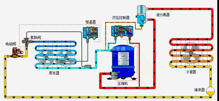 如制冷劑與潤滑油相互不溶解,進入冷凝器或貯液器中的潤滑油必須分離出來。否則,如潤滑油進入節流機構,有可能凝固在節流機構中,形成“油堵”。在這種情況下,系統中必須設有油分離器,采用分離回油。