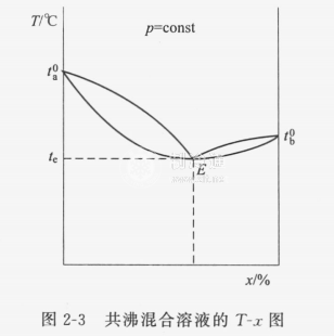 共沸混合制冷劑是作為制冷劑使用的共沸溶液.共沸溶液的T-z圖如圖2-3所示,其等壓飽和液線與等壓飽和氣線有一重合點(diǎn),此重合點(diǎn)即共沸點(diǎn)。共沸點(diǎn)處溶液的濃度稱為共沸濃度,溫度稱為共沸溫度。當(dāng)此溶液的濃度為共沸濃度時(shí),在等壓下聚集態(tài)改變過程中,溫度不發(fā)生變化,且氣相濃度與液相濃度相同。在共沸濃度下,溶液共沸溫度僅與飽和壓力有關(guān),溶液的特性與單一物質(zhì)相同。