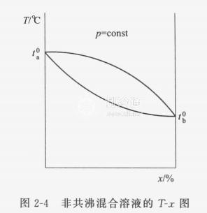 非共沸混合制冷劑是作為制冷劑使用的非共沸溶液。非共沸溶液的T-x圖如圖2-4所示,其等壓飽和液線與等壓飽和氣線構成典型的魚形曲線。