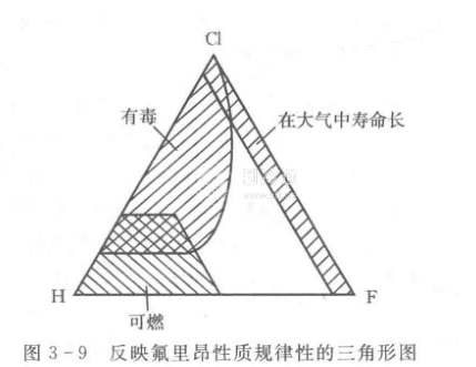 氟里昂的其它理化性質有一定的規律性:含H原子多的,可燃性強;含CI原子多的,有毒性;含F原子多的,化學穩定性好;完全鹵代烴在大氣中具有長壽命。麥克林頓(Mclinden )和迪第昂(Didion)將上述規律用三角形圖形象描述,如圖3一9所示。對臭氧破壞作用大的是氟里昂中含氯原子(還有溴原子)而又有長大氣壽命的物質,CFC類是其中的典型,成為首批被淘汰的制冷劑。對它們的替代必須同時考慮GWP和安全性。例如:歐洲議會規定汽車空調器用制冷劑的GWP應小于150。安全性包括毒性和可燃性,對可燃性的考慮方法與碳氫化合物相同。