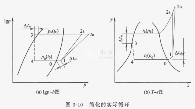 由于實際循環的每一個過程均非準靜態過程,無法在Ts圖及lgph圖上準確描述,上述圖示只是近似的。