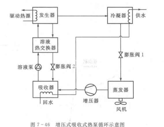 增壓式吸收式制冷的目的是提高吸收機的制冷量和COP,以及用來降低所需驅動熱源的溫度,從而利用太陽能、余熱及廢熱等低品位熱能。這里所論述的增壓吸收式熱泵(見圖7-46),主要特點為: