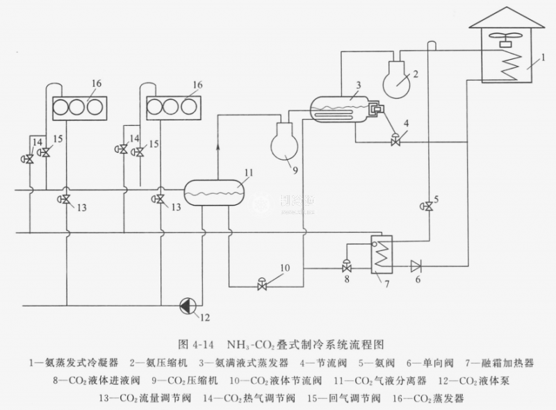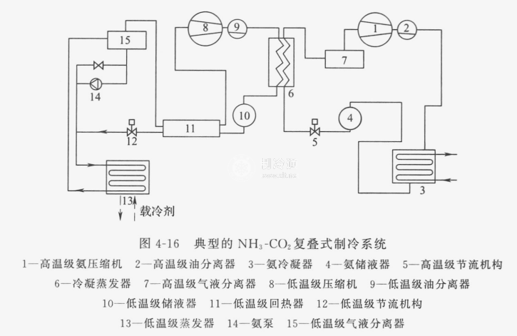 典型的NH3-CO2復疊式制冷機實際循環如圖4-16所示。采用NH3-CO2復疊制冷,可組成生產干冰的制冷系統。根據CO2冷凝壓力的不同,生產干冰用的復疊式制冷系統分為低壓方案和中壓方案。低壓方案為一個兩級壓縮氨制冷系統作為高溫部分與一個單級壓縮CO2制冷系統作為低溫部分組成的復疊式制冷機;中壓方案為一個單級壓縮氨制冷系統作為高溫部分與一個兩級壓縮CO2制冷系統作為低溫部分組成的復疊式制冷機。
