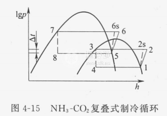 NH3-CO2復疊式制冷循環由NH3高溫級制冷循環和CO2低溫級制冷循環疊加而成,兩個獨立的制冷系統通過蒸發一冷凝器(中間換熱器)耦合起來,該系統既能滿足在較低蒸發溫度下蒸發時合適的蒸發溫度,又可以滿足在環境溫度下冷凝時適中的冷凝壓力。系統流程及對應的循環lgp-h圖分別如圖4-14、圖4-15所示。圖中1-4為低溫級CO2帶節流閥制冷循環,5-8為高溫級帶節流閥制冷循環。因為低溫級的放熱過程(圖中2-3過程)和高溫級的吸熱過程(圖中5-8過程)發生在蒸發一冷凝器中,而且,換熱過程與環境沒有熱交換,因此可以認為,高溫級循環的蒸發負荷與低溫級循環的冷凝負荷相等,蒸發一冷凝器中的傳熱溫差一般取5-8℃。