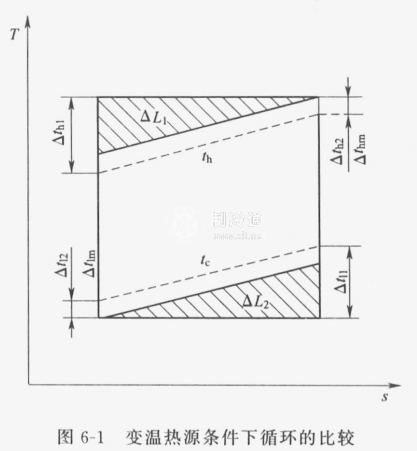 如圖6-1所示,在變溫熱源條件下,如循環以與逆卡諾循環相同的工作過程進行,其冷凝溫度應高于冷卻介質的出口溫度,設其為△th2 ,此時冷凝溫度與冷卻介質進口溫度之間存在有較大的溫差△th1, th1取決于冷卻介質的熱容量和質量流量,其平均溫差為△th2 = f (△th1, th2 )。同理,蒸發溫度與被冷卻介質進口溫度之間也存在較大溫差,其平均溫差可寫為△t1 = f (△tl1, tl2 )。在極限情況下,△th2與△tl2可以為零,但△th與△tl不可能為零。