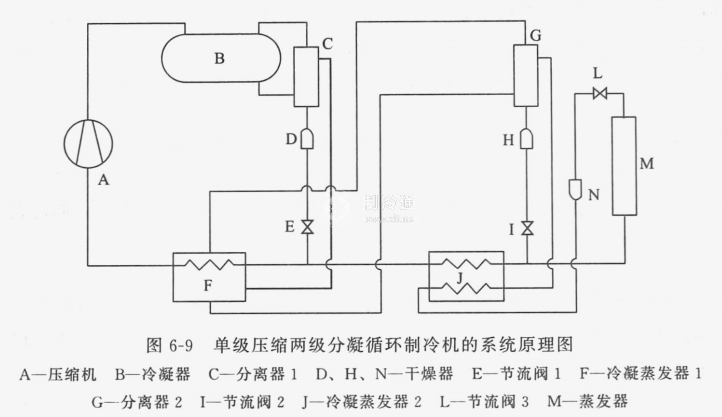 圖6-9為單級壓縮兩級分凝循環制冷機的系統原理圖。壓縮后的制冷劑先進入冷凝器B中進行第一次分凝,然后進人分離器C中分成氣液兩部分,液體中富高沸點組分,氣體中包含幾乎全部低沸點組分和一部分高沸點組分。富高沸點組分的制冷劑液體經過干燥器D由節流閥E節流后,進入冷凝蒸發器F中蒸發。由分離器C來的混合氣體進入冷凝蒸發器F中進行第二次分凝,然后進入分離器G中分成氣液兩部分,液體由一部分低沸點組分和一部分高沸點組分組成,稱為混合液體;氣體中包含幾乎全部為低沸點組分。混合液體經干燥器H由節流閥I節流后,進入冷凝蒸發器J中蒸發。