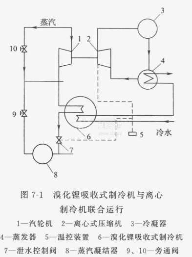 當供汽壓力較高,如0. 7~4. 0MPa時,直接應用蒸汽型雙效溴化鋰吸收式制冷機時須經節流降壓,降低了能源的利用效率。為了充分利用較高品位的蒸汽能源,可采用離心制冷機與溴化鋰吸收式制冷機聯合運轉的方案,如圖7-1所示。來自鍋爐的一次蒸汽,經背壓式汽輪機,帶動離心制冷機,壓力降至0. 2~0. 4MPa的二次蒸汽,用作溴化鋰吸收式制冷機的熱源。如果汽輪機的背壓蒸汽壓力較高,可與低壓蒸汽雙效機聯合;當背壓蒸汽壓力低于0. 2MPa時,與單效機聯合。
