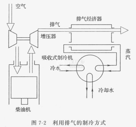 利用排氣的制冷方式如圖7-2所示,將柴油機的排氣用于廢熱鍋爐(經濟器)來產生蒸汽,利用這些蒸汽作為溴化鋰吸收式制冷機中發生器的熱源而制取冷水。