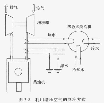 利用增壓空氣的制冷方式圖7-3所示,將高溫的增壓空氣在熱交換器中制取熱水,而以此熱水作為溴化鋰吸收式制冷機的熱源。