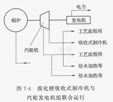 溴化鋰吸收式制冷機(jī)與汽輪發(fā)電機(jī)組聯(lián)合運(yùn)行是一種電熱冷聯(lián)供系統(tǒng),如圖7-4所示。壓力較高的一次蒸汽進(jìn)入汽輪機(jī),帶動(dòng)發(fā)電機(jī)工作,向電網(wǎng)供電。它的二次蒸汽用于溴化鋰吸收式制冷機(jī),制取低溫冷水。此外,二次蒸汽也可用作工藝過(guò)程或給水的加熱。為了充分利用汽輪機(jī)二次蒸汽的熱能,應(yīng)盡可能選用低壓蒸汽雙效溴化鋰吸收式制冷機(jī)。如果二次蒸汽的壓力較低,或其他工藝過(guò)程需要,也可采用抽汽的方法,以滿足低壓蒸汽雙效機(jī)和工藝過(guò)程用汽的要求。溴化鋰吸收式制冷機(jī)與汽輪發(fā)電機(jī)組聯(lián)合運(yùn)轉(zhuǎn)的最大優(yōu)點(diǎn)是:容易實(shí)現(xiàn)部門或區(qū)域性供電、供熱、供冷的平衡,從而提高能源的利用效率,達(dá)到大幅度節(jié)能的效果。