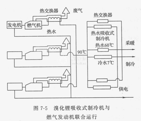 溴化鋰吸收式制冷機(jī)與燃?xì)獍l(fā)動(dòng)機(jī)聯(lián)合運(yùn)行是另一種電熱冷聯(lián)供系統(tǒng),如圖7-5所示。