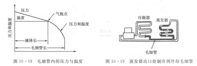 通常,毛細管受蒸發器出口處低溫制冷劑的冷卻,以進一步冷卻毛細管內的制冷劑。其原理圖如圖10一19所示。