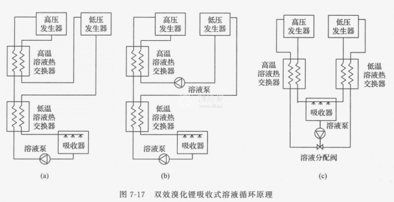 圖7-17 (b)所示的串聯流程,由吸收器出來的稀溶液經溶液泵升壓,流經低溫熱交換器,溫度升高后進入低壓發生器,被來自高壓發生器的高溫冷劑水蒸氣加熱,使溶液的濃度和溫度升高.然后溶液由高壓發生器排出,由第二個溶液泵再次加壓并經高溫熱交換器升溫后進入高壓發生器,被工作蒸汽或高溫水加熱產生冷劑水蒸氣,溶液的濃度進一步提高。由于在低壓發生器中溶液的濃度低于高壓發生器,而加熱介質溫度也低于高壓發生器,低壓發生器中溶液可產生較多的冷劑蒸汽。但由于溶液需二次加壓,多了一個溶液泵,增加了耗電。