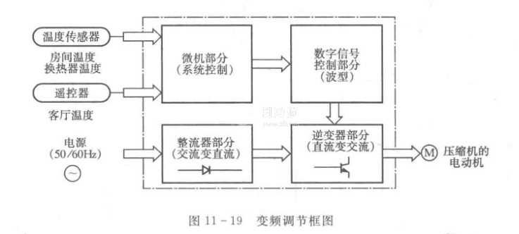 變頻調節框圖如圖11一19所示。交流電源經過整流濾波后轉變成直流電,根據微機系統發出不同數字信號再逆變成不同頻率的交流電,輸入到壓縮機的電動機,達到改變轉速的目的。