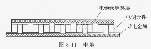 電堆是熱電制冷器最重要的組成部分,通常電堆由電偶元件、導電金屬片和電絕緣導熱層組成,如圖8-11所示。導電金屬片一般用純銅或銅鍍銀制成,其作用是將各電偶元件連接起來,以構成電路。電偶元件與導電金屬片采用釬焊焊接在一起。電絕緣導熱層即是電堆的支承結構件,又起各導電金屬片之間的絕緣作用,還是電堆與冷、熱端換熱器間的導熱體。