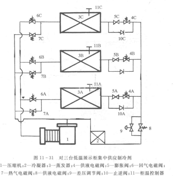 11-31為一臺冷凝機組帶動三臺低溫展示柜進行集中供冷的制冷系統,用熱氣除霜。對一臺展示柜除霜時,另外兩臺展示柜繼續正常運轉。除霜的展示柜融霜時產生的制冷劑冷凝液直接供給另外兩臺展示柜,在這兩臺展示柜中制冷。