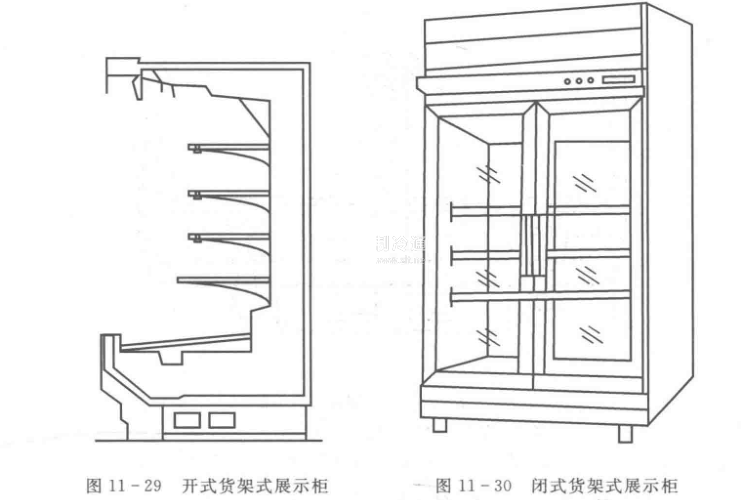 閉式貨架式展示柜如圖11-30所示,其四周全封閉,正面設有金屬框玻璃拉門。相對于開式陳列柜,其柜內(nèi)溫度比較穩(wěn)定,更適合某些對溫度波動較敏感,且衛(wèi)生要求較高的食品,如