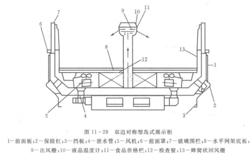 島式展示柜的壓縮冷凝機組多數單獨安裝在機房中,它有單邊型也有雙邊對稱型,雙邊對稱型如圖11-28所示,冷風從中間向兩邊吹送。單邊型島式展示柜取消了中間出風隔離,內容積相對較大,更適于大量存貨陳列。島式展示柜都為敞開式,置于超市商場中央,呈一字形排列,可長達數十米,顧客可以從四周選購食品,敞開的開口方便顧客選購。島式展示柜四周裝有高240 mm左右的玻璃圍欄,既有利于柜內溫度的穩定,減少冷量損失,又可以讓顧客多方位看清食品。