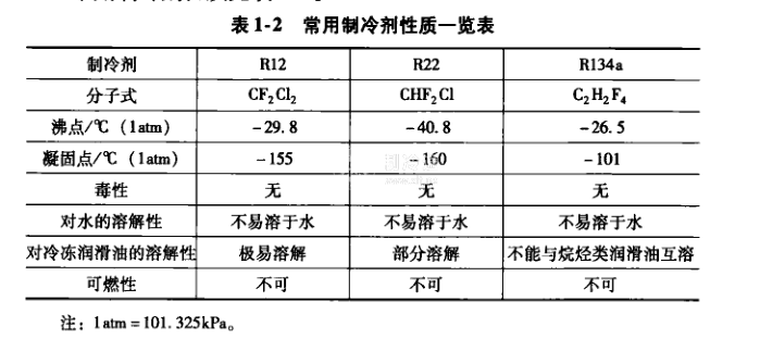 常用制冷劑性質(zhì)見表1-2。