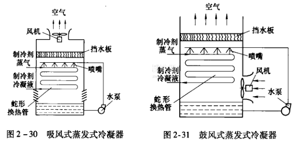 為了加強(qiáng)冷凝器的冷卻效果,在中央空調(diào)冷源機(jī)組中還使用蒸發(fā)冷凝器。蒸發(fā)式冷凝器常用的有吸風(fēng)式和鼓風(fēng)式兩種,其結(jié)構(gòu)示意如圖2-30和圖2-31所示。