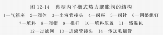 圖12-14為典型內平衡式熱力膨脹閥的結構,其通道結構為圓錐形,調整機構在閥的下端,外平衡式熱力膨脹閥其通道結構為圓錐支承面盤形,調整機構在閥的側面。