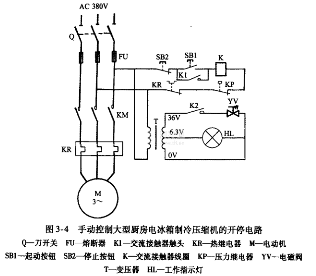 手動控制大型廚房電冰箱制冷壓縮機的開停電路是控制電路中基本的電路,其典型電路如圖3-4所示。