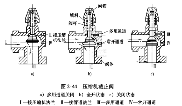圖2-44所示為截止閥工作狀態圖。截止閥的調整方法是:順時針轉動閥桿2~3圈,截止閥各通道處于互通狀態,稱為全開狀態,若順時針轉動閥桿至不動位置,截止閥處于關閉狀態,但此時多用通道仍處于導通狀態,使其連接的控制儀表仍能測試此時的系統參數。