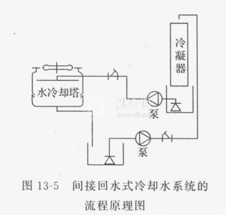 間接回水式 如冷卻水由冷凝器依靠重力落入回水池,則系統為間接回水式。圖13-5為間接回水式冷卻水系統的流程原理圖。