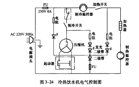 圖3-24所示為家用小型冷熱飲水機的電氣控制圖。該飲水機用制冷開關和加熱開關分別制取冷水和熱水,冬季不需要冷飲時,可關閉制冷開關,啟動加熱開關。