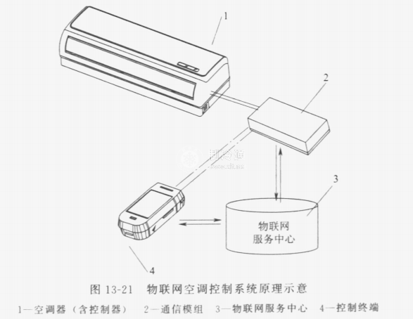在物聯網空調系統中,為了能使空調器與云服務中心和用戶互動,空調器需要接入互聯網功能,這就要求對空調控制器進行專門改進設計,使其具備上述功能。圖13-21為物聯網空調的控制系統,該系統包括控制終端、通信模組等,其中:控制終端與通信模組通過物聯網服務中心實現遠程虛擬連接,通信模組與空調控制器以通信總線方式實現直接連接。