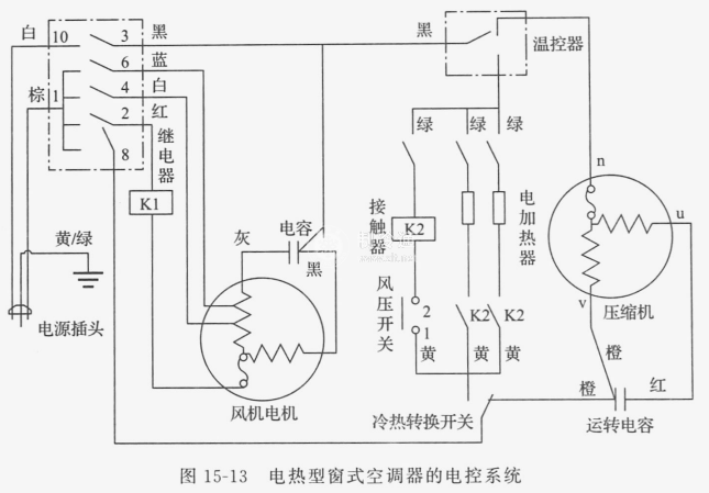 圖15-13為窗式空調(diào)器的一種電控系統(tǒng),此系統(tǒng)為典型的繼電控制系統(tǒng)。當(dāng)轉(zhuǎn)換開關(guān)置于“高冷”位置時(shí),3-10, 1-8, 1-2通,壓縮機(jī)運(yùn)轉(zhuǎn),風(fēng)機(jī)高速運(yùn)轉(zhuǎn);置于”中冷”位 置時(shí),3-10, 1-8, 1-4通,風(fēng)機(jī)中速運(yùn)轉(zhuǎn);置于“低冷”位置時(shí),3-10, 1-8, 1-6通,風(fēng)機(jī)低速運(yùn)轉(zhuǎn)。當(dāng)轉(zhuǎn)換開關(guān)置于“高風(fēng)”位置時(shí),僅3-10, 1-2通,壓縮機(jī)不運(yùn)轉(zhuǎn),風(fēng)機(jī)高速運(yùn)轉(zhuǎn);置于“中風(fēng)”位置時(shí),僅3-10, 1-2通,風(fēng)機(jī)高速運(yùn)轉(zhuǎn);置于“低風(fēng)”位置時(shí),僅3-10, 1-6通,風(fēng)機(jī)低速運(yùn)轉(zhuǎn)。當(dāng)轉(zhuǎn)換開關(guān)置于“停”位置時(shí),各觸點(diǎn)均不通。當(dāng)溫度下降到溫控器動(dòng)作溫度時(shí),溫控器切斷壓縮機(jī)電源,但風(fēng)機(jī)繼續(xù)運(yùn)行。當(dāng)壓縮機(jī)溫度過高或電流過大時(shí),過載保護(hù)器切斷壓縮機(jī)電源,風(fēng)機(jī)繼續(xù)運(yùn)行。冷熱轉(zhuǎn)換開關(guān)控制是壓縮機(jī)運(yùn)轉(zhuǎn)或是電加熱器工作。