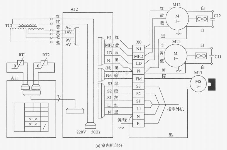 圖15-15為某分體柜式空調(diào)器的電控原理圖。其室內(nèi)機(jī)部分由操作顯示板A11、電源繼電器板A12、風(fēng)機(jī)電機(jī)M11和M12,搖風(fēng)電機(jī)M13等組成。室外機(jī)部分由室外控制板、交流接觸器、熱繼電器、壓力控制器、壓縮機(jī)電機(jī)、室外風(fēng)機(jī)電機(jī)等組成。此系統(tǒng)是一種帶有流晶數(shù)字顯示、觸摸按鍵操作的單片機(jī)控制電路,具有運(yùn)轉(zhuǎn)顯示、自診斷和故障顯示等功能。