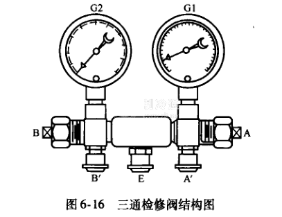 三通檢修閥的結構如圖6-16所示。G1-0.1~1 MPa的聯程壓力表,G20~1.6 MPa的壓力表。