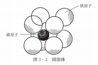 碳在鐵中存在的狀態可能是溶解在鐵中形成固溶體,或與鐵化合而成化合物Fe3 C(稱為滲碳體)。所謂溶解,就是在固體狀態下,鐵的晶格空隙處容納碳原子。在一種元素的晶格中溶入他種元素形成的結構稱為固溶體(見圖33)。我們把含量較多的鐵元素稱為溶劑,而溶入的碳元素稱為溶質。固溶體保持基本金屬()的原有晶格形式。由于原子間的空隙地位有限,所以容納碳原子的數量也有限度,即鐵中的溶碳量有一定的限度。在α-Feγ-Fe,都可以溶入碳原子而成為固溶體。對于α-Fe的間溶體稱為鐵素體,對于γ-Fe的固溶體稱為奧氏體。