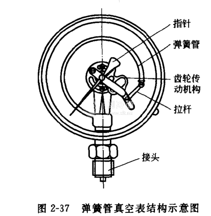彈性式真空表的原理是利用彈性元件(彈簧管、膜片、膜合、波紋管等)在壓差的作用下產生相應的位移,經傳動放大機構,將被測壓力指示在刻度盤上。若再增設電接點等附加裝置,則可實現控制報警。最常用的為彈簧管真空表。它又稱波登(Bourdon)表或波登規。圖2-37為其結構示意圖。
