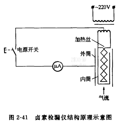 核心提示:當鉑絲加熱到800-900℃時會產生正離子發射,在鹵素氣氛中這種正離子發射將急劇增加,這就是“鹵素效應”。利用此效應制成的檢漏儀稱為鹵素檢漏儀,其結構原理圖如圖2-41所示。