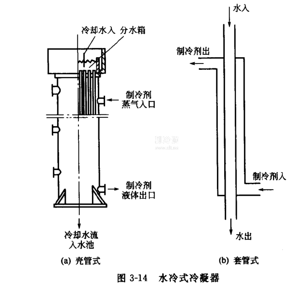 按所采用的冷卻介質的不同,冷凝器可分為:水冷式、氣冷式和水冷、氣冷并用式三類,水冷式冷凝器的冷卻效果較好,主要有殼管式和套管式(圖3-14),需要配置冷卻水循環設備。水冷式冷凝器有各種型號、結構,與壓縮機及其他機件相配套。常用的殼管式冷凝器,它是在一個圓柱形的密閉鋼筒中套裝許多由銅管或無縫鋼管組成的冷卻管,冷卻水在管內流動,氣態制冷劑導人鋼筒后沿冷卻管間隙流動,進行熱交換并液化。中小型制冷機多采用臥式殼管冷凝器,還可兼作液態制冷劑的貯液罐,并與整個制冷系統中除蒸發器以外的各種部件組裝在一起構成一個機組。