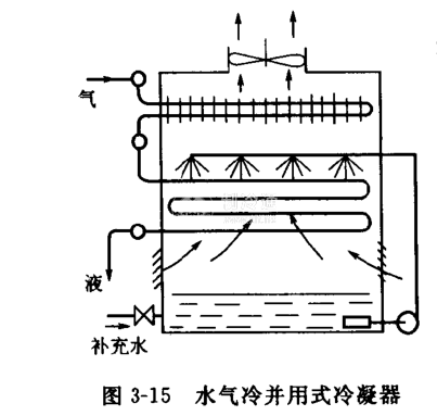 水氣冷并用式冷凝器有燕發式和噴淋式結構(圖3-15).其利用水從制冷劑中吸熱蒸發而使制冷劑凝結,蒸發出來的水又被空氣帶走。這種冷凝器具有耗水量小的特點,常用于大中型氨制冷裝置。