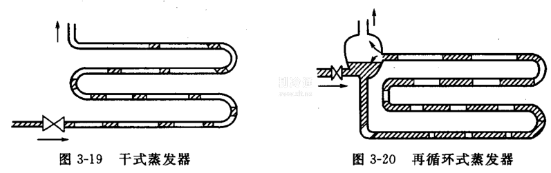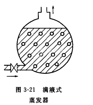 再循環式蒸發器,制冷劑不能一次完成汽化。用蒸發器出來的兩相混合物進入分離器,分離出來的蒸氣被吸入壓縮機,液體則再次進入蒸發管。經過這樣多次循環才能完全汽化,如圖3-20所示。