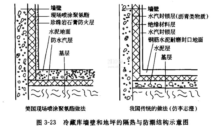圖3-23為冷藏庫的隔熱與防潮結構示意圖。
