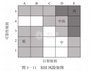 圖9一11是API 581定義的風險矩陣,其縱軸代表失效可能性,依據失效可能性的大小分為1-5級;橫軸代表失效后果,依據后果的大小分為A-E級。