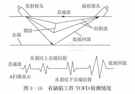 圖9一16是有缺陷工件TOFD檢測情況,A掃描信號中直通波,缺陷上、下尖端信號和底面反射波的波形圖,上尖端信號就像底而反射信號一樣,相位變化了180°。缺陷下尖端的衍射信號相位不發生改變,可以解釋為波束只是在缺陷底部環繞,沒有發生界面反射,如果上尖端信號相位從負向周期開始,與底面反射信一號相同,那么下尖端信號就是從正向周期開始,其相位與直通波信號相同。