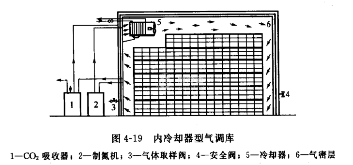 1.內冷卻器型氣調庫  這種形式是把冷卻器安裝在氣調庫內,庫外安裝氣調設備。如圖4-19所示。