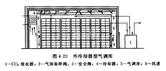 核心提示:外冷卻器型氣調庫 如圖4-20所示,是在氣密室外安裝冷卻器,在冷藏庫外安裝氣體發生裝置。這種氣調庫,一般是在普通冷藏庫的基礎上改造的,實質上是一座夾套式氣調庫。