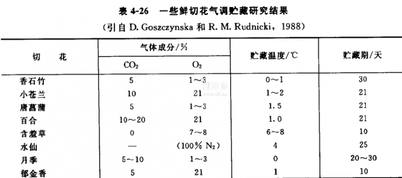 4.水仙花在100% N?中貯藏有很好的效果,在溫度4℃時(shí),貯存14~25天后,切花瓶插壽命延長(zhǎng)80%~100%。這一結(jié)果已被多次試驗(yàn)所證實(shí)(表4-26)。