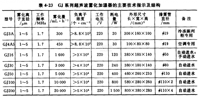 它可直接噴霧,這種方法還具有霧化粒子細((1-55m),負離子濃度高、省電、使用方便等特點。這種方法除了適用于氣調庫之后,還可用于超市新鮮農產品貨架或陳列柜的加濕。也可用于紡織、空調、水泥生產、食品加工以及舞臺煙霧與人工霧化裝飾等領域。表4-23為GJ系列超聲波霧化加濕器的主要技術指標與結構。超聲波換能器的平均壽命》5 000h。這種加濕器還具有運行顯示、故障和過載保護、霧量大小調節、自動供水、缺水自動報警、無水自動斷電以及由軟管排霧輸出等功能。